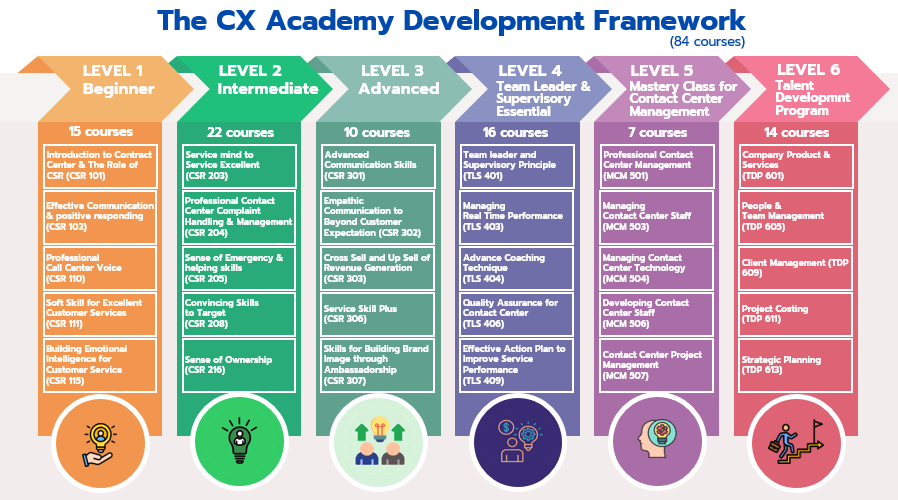 ปัจจุบัน The CX Academy  ได้ออกแบบหลักสูตรการเรียนรู้มากกว่า 80 หลักสูตร บนframework ในการพัฒนาใน 6 ระดับ โดยมีการปรับเปลี่ยนหลักสูตรอบรมให้สอดคล้องกับความคาดหวัง การบริการและการสร้างประสบการณ์ลูกค้า และพัฒนาหลักสูตรอย่างต่อเนื่อง